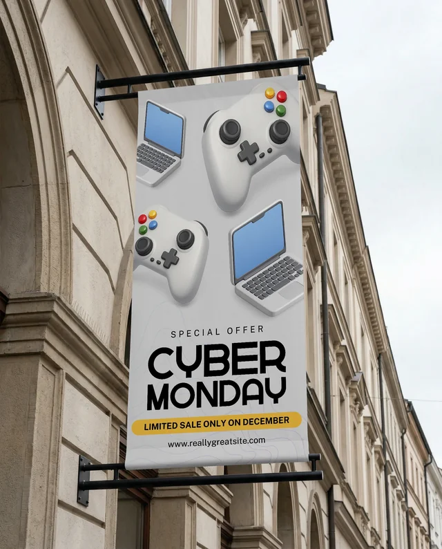 Use horizontal banner mockup for wide-format layouts like website headers or retail signage. Use hanging banner mockups for ceiling-mounted displays at events or stores.