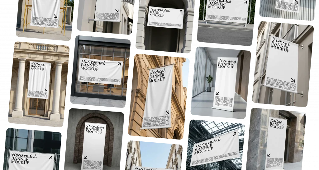Use horizontal banner mockup for wide-format layouts like website headers or retail signage. Use hanging banner mockups for ceiling-mounted displays at events or stores.