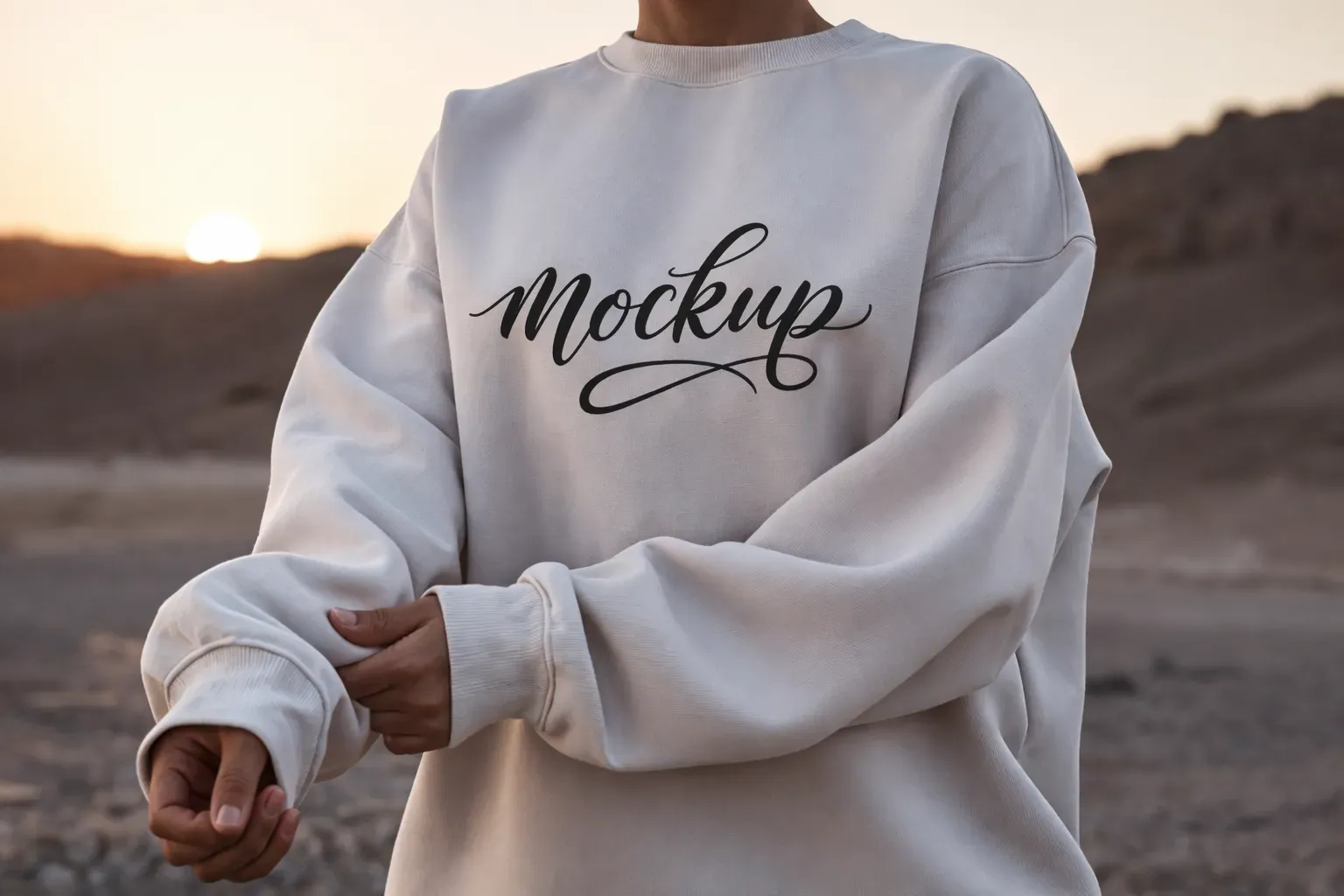 Warm sunset tones make this sweatshirt mockup feel emotional and soft. It adds depth to your artwork. Use Case: Ideal for indie shops and aesthetic fashion brands.