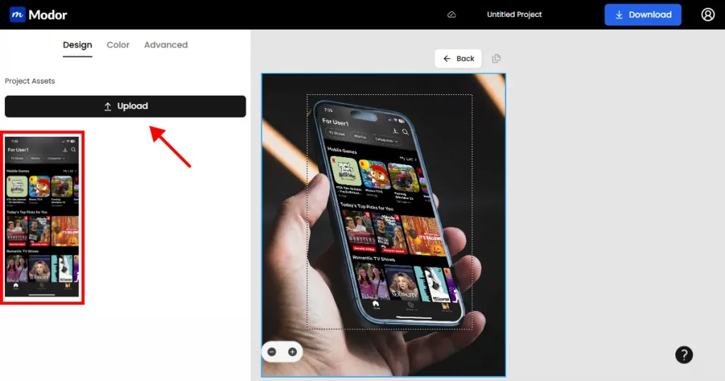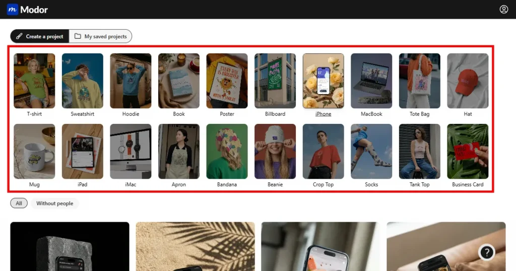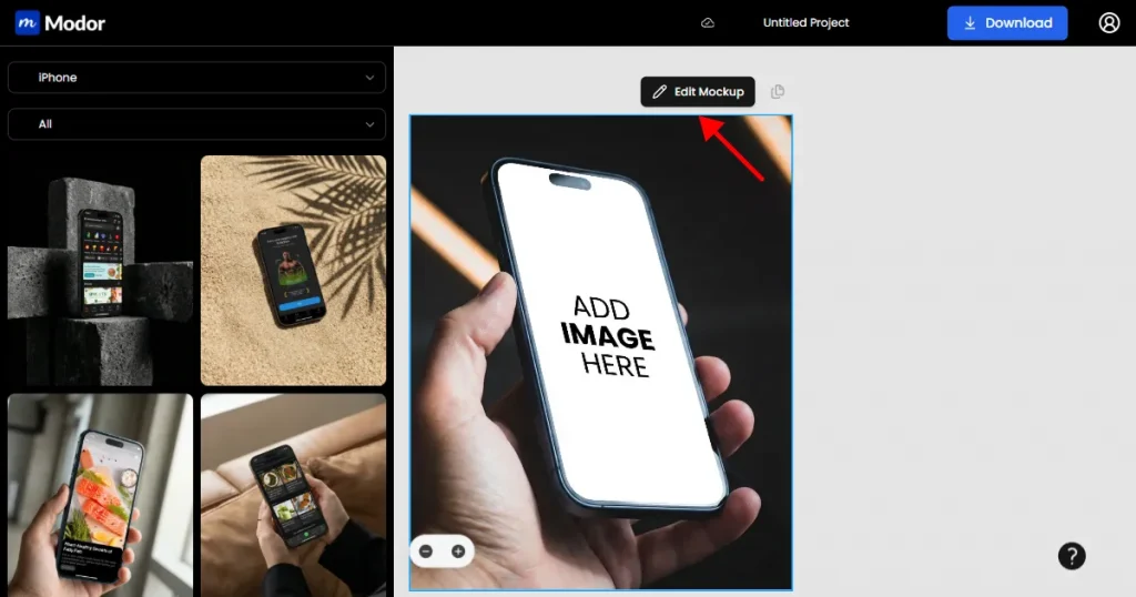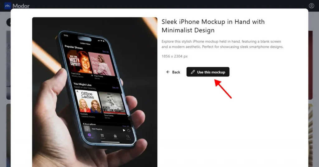 Modor makes it very simple to create high-quality iPhone mockups. Its AI automatically fits your screen, adjusts the lighting, and blends everything into the background so it looks natural.