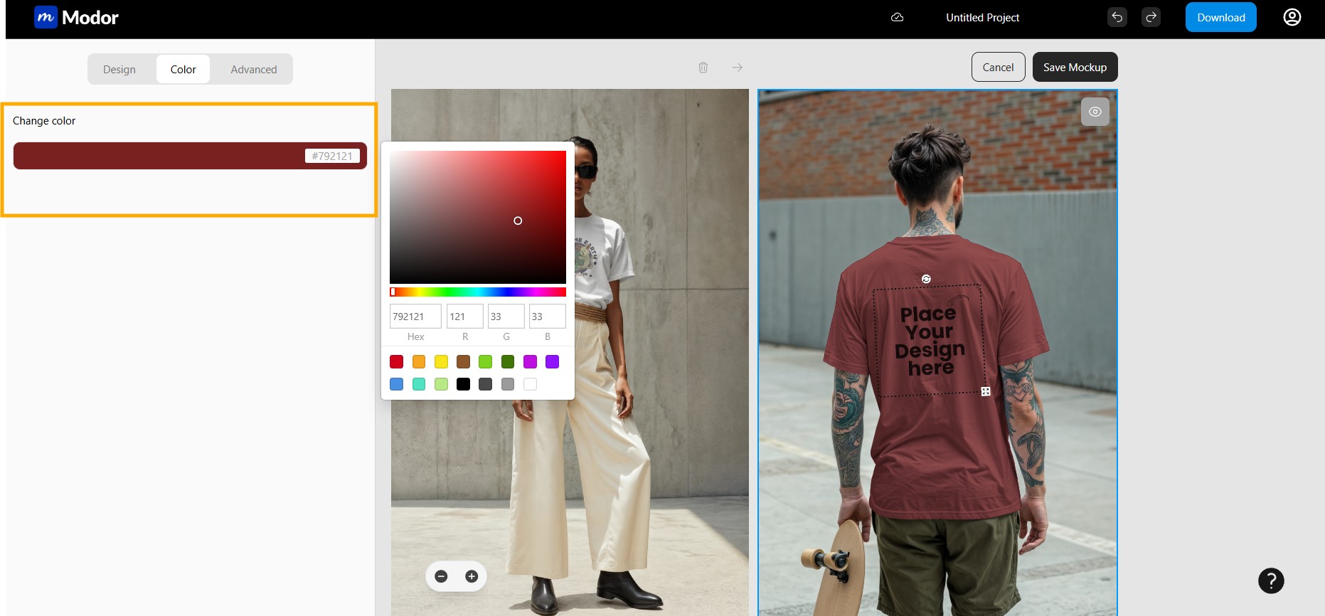 Although many tools offer a free plan, they either have limited resources or do not provide watermark-free mockups. On Modor, you can make T-shirt mockups with no charge. It offers high-quality, realistic mockups for free, with no watermark, and high-resolution downloads (JPG or PNG format) - perfect for e-commerce listings, social media, and promotional campaigns.