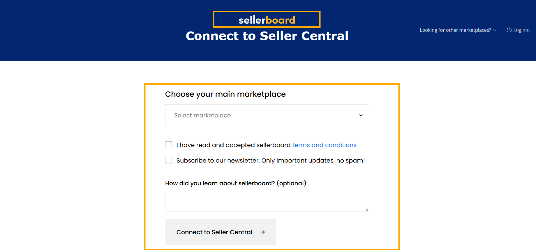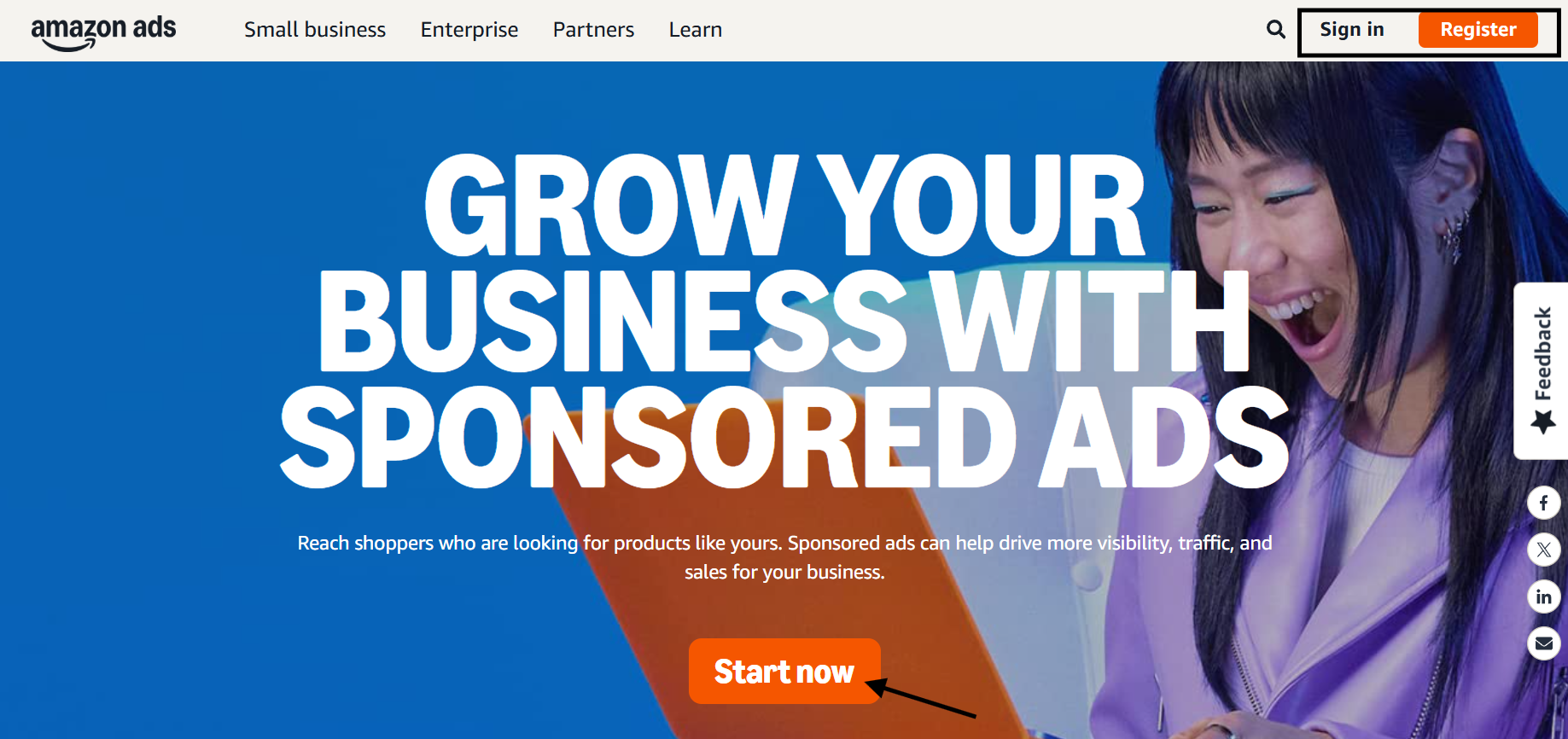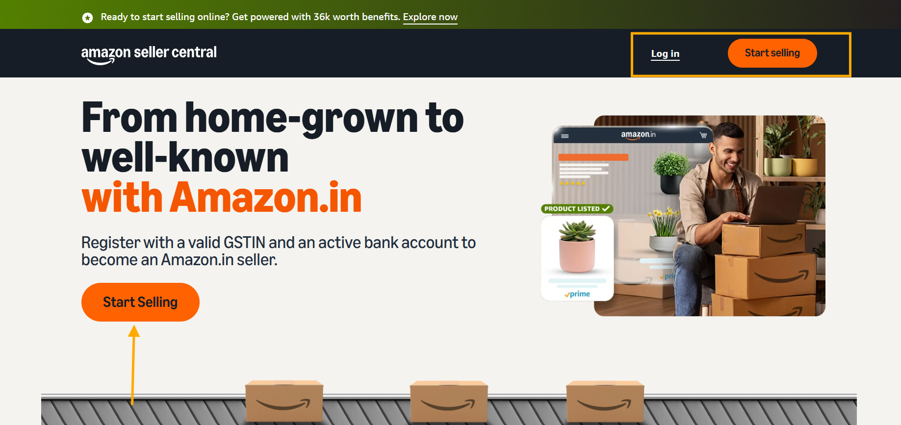 Go to the Amazon Seller Central page and then click on Start Selling. Provided that you already have an Amazon customer account, you can use those details to log in and start the seller registration process. Otherwise, choose to create a new Amazon account.