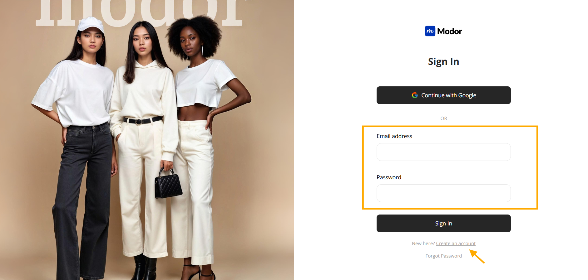 Create an account: Visit modor.io and sign up with Google or email. If you already have an account, log in with your saved credentials.
