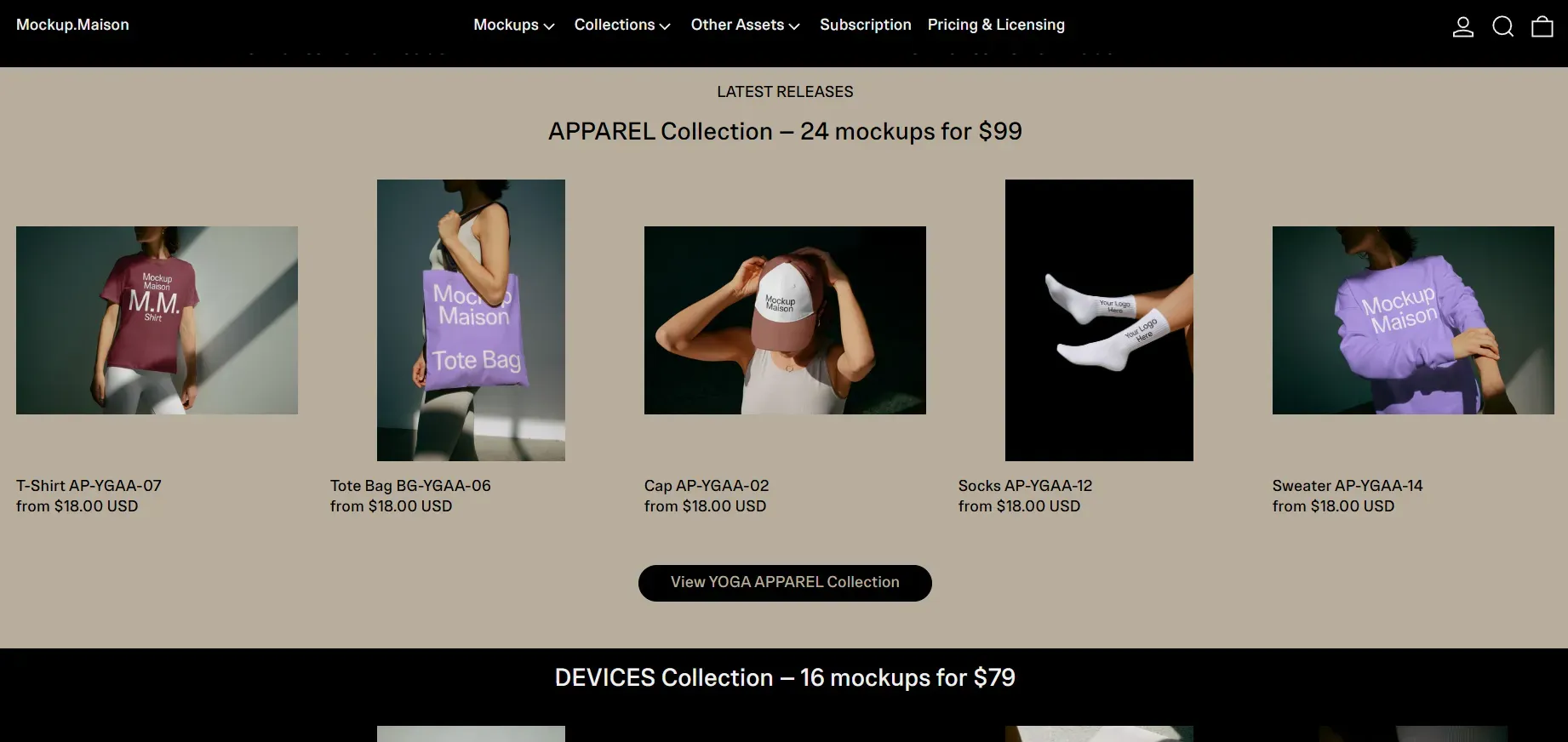 Mockup Maison operates on a Pay-per-Bundle Model (collections start at $25, bundles can be $99+) or a $1,300/year subscription. Individual mockups start around $18.