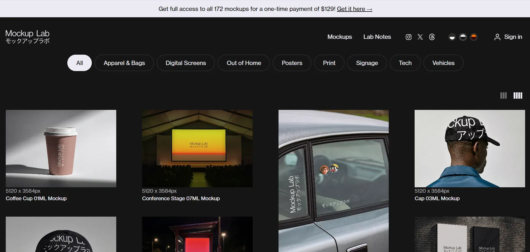 Mockuplab has a unique working model. It's a membership-based library that gives you a small, curated set of 172 PSD mockups for a one-time fee. It's a simple Mr. Mockup alternative for small studios that hate subscriptions.