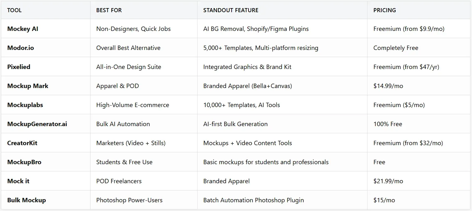 If Mockey AI doesn't quite fit your needs, the 2025 market is full of powerful alternatives. Here is a high-level comparison of the nine best alternatives.