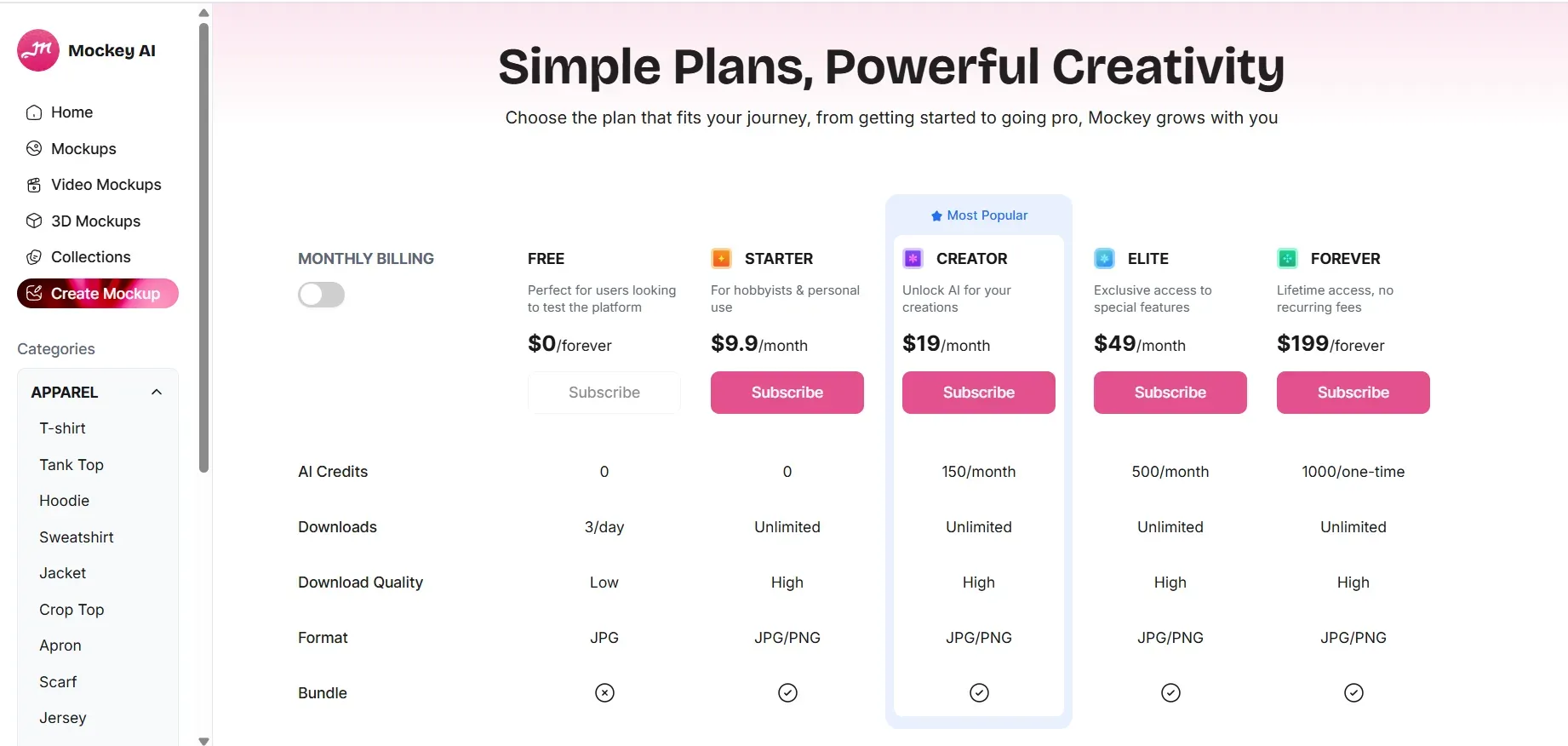 Mockey AI operates on a freemium model. While it has a free plan with basic features and limited mockups, the paid subscription unlocks premium templates, higher resolutions, and commercial licensing. Mockey’s paid subscription starts at $9.9/month.
